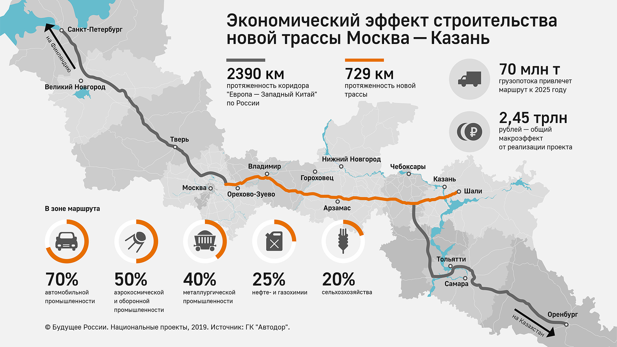 Скоростная магистраль М-12 «Москва – Казань» является частью международного транспортного маршрута «Европа — Западный Китай» (МТМ ЕЗК), ее протяженность составляет 794 км. По заявлению премьер-министра Российской Федерации Михаила Мишустина в ближайшие три-четыре года М-12 будет самым масштабным дорожным проектом России, имеющим особое значение для всего евразийского пространства. Суммарный прирост внутреннего регионального продукта в регионах прохождения магистрали к 2050 году составит более 500 млрд рублей. Проект реализуется в рамках Комплексного плана модернизации и расширения магистральной инфраструктуры, ввод в эксплуатацию запланирован на 2024 год.