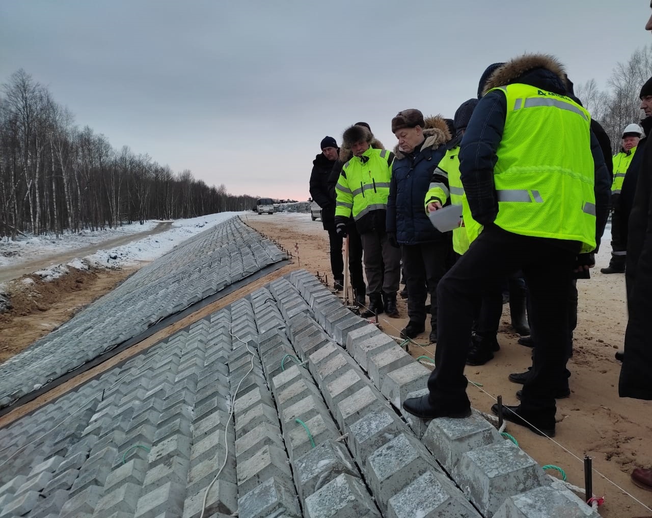 До конца марта запланированы снятие почвенно-растительного слоя в объеме  41 500 м3; разработка грунта – 30 000 м3; устройство насыпи – 30 054 м3; укрепление гибкими плитами – 58 063 м2; укрепление сборными железобетонными плитами – 4 375 м2; укрепление откосов георешеткой – 25 500 м2; устройство водоотводных лотков – 1 351 штук.