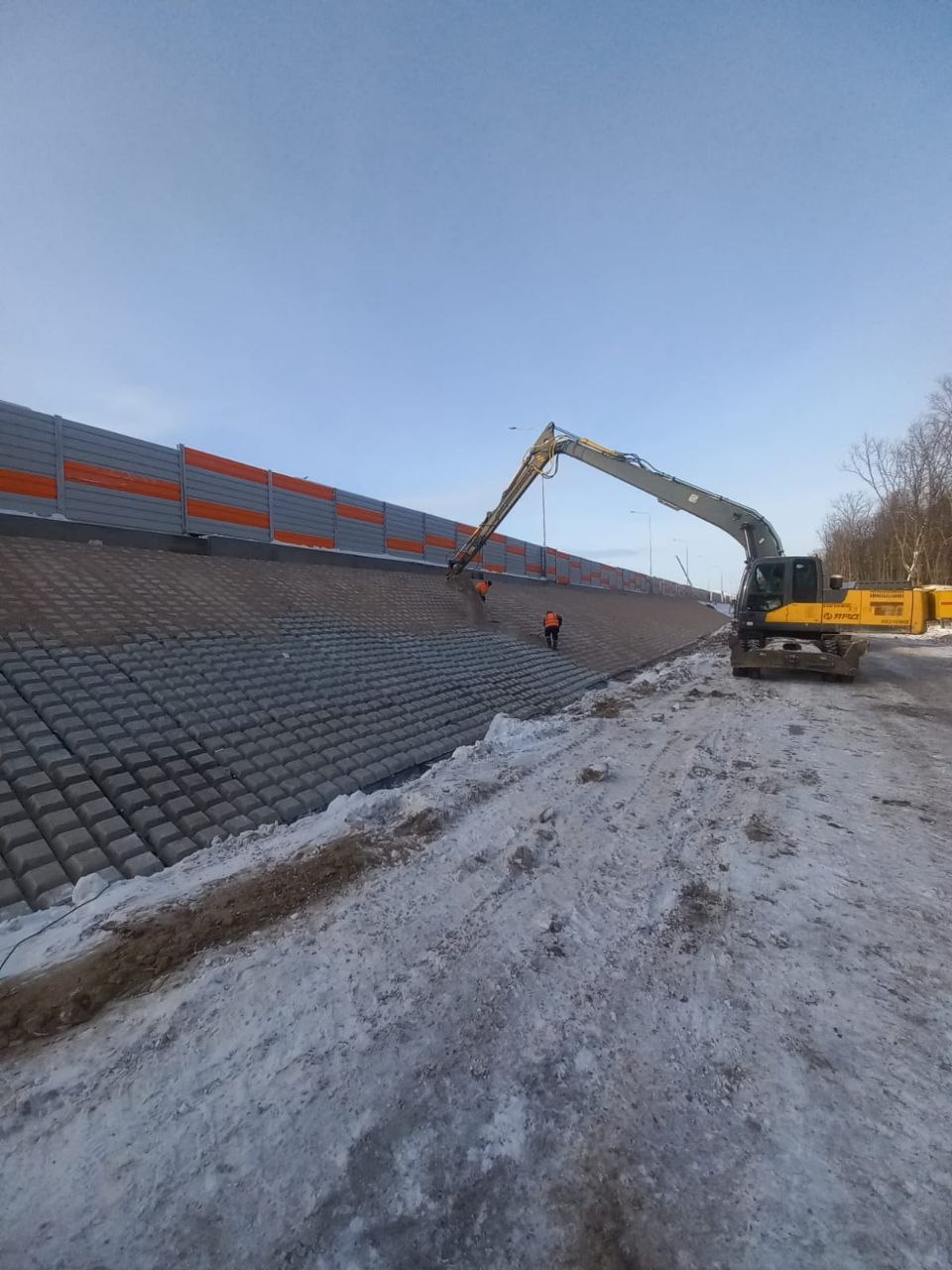 После укладки выполняются соединение ГБП/ГБМ между собой, установка грунтового анкера, крепление к нему ГБП/ГБМ и засыпка пазух ГБП/ГБМ щебнем фракций от 5 до 20 мм. На текущий момент выполнено 83% работ: уложено около 191 тыс. м2 из 228 тыс. м2.